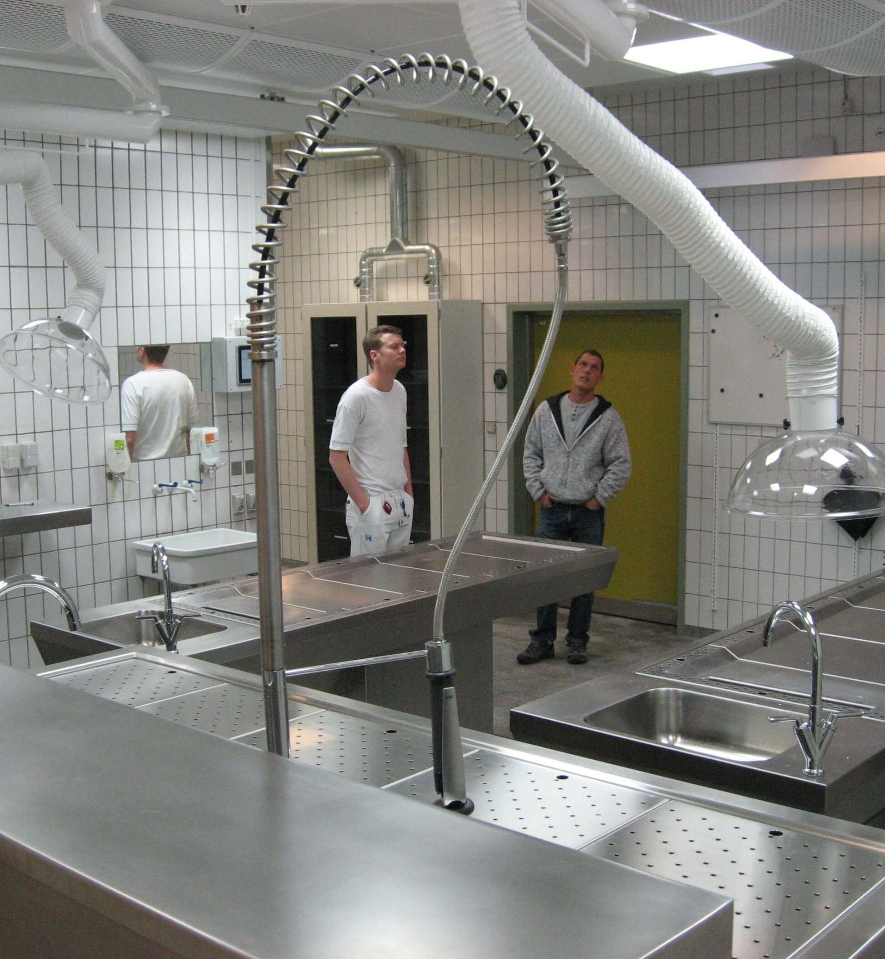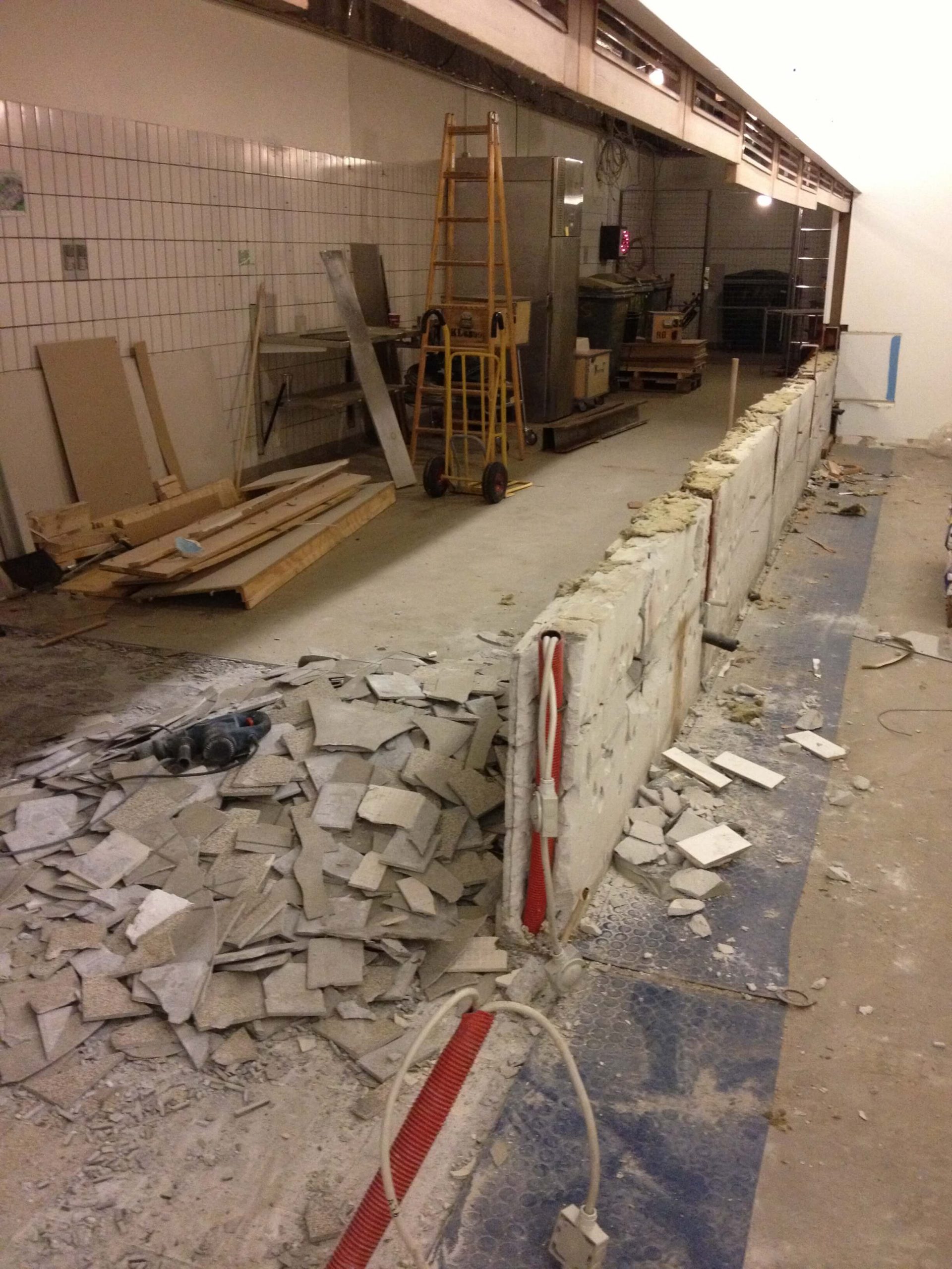 Nedrevet eksisterende rum, opsat byggehejs på facade, omlægning af terrazzogulve, nye lofter i 2 plan